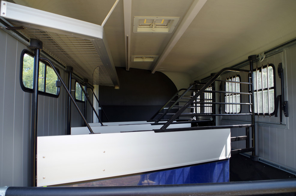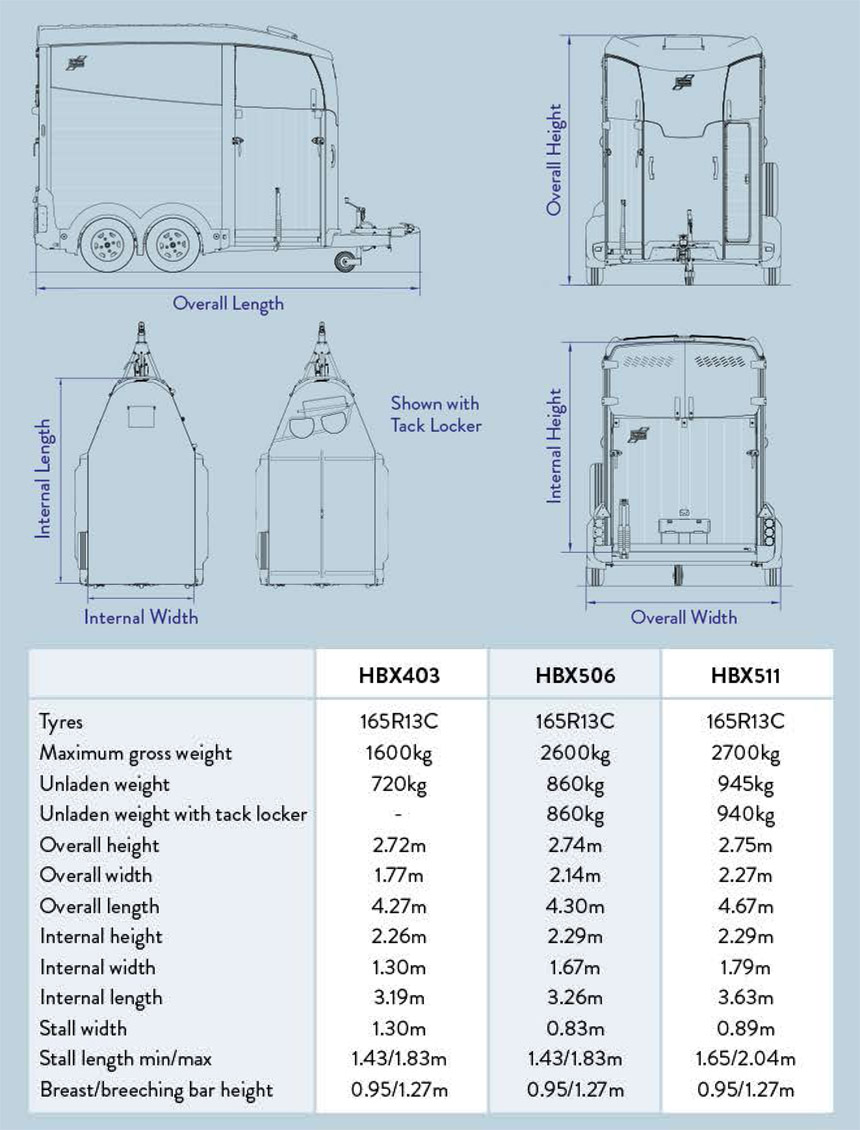 | Capacité de charge élevée. HBX506 : poids maxi 2600kg, possibilité de transporter jusqu'à 2 chevaux de 900kg. Optimax : poids maxi 3500kg, possibilité de transporter 3 chevaux de 730kg ou 4 chevaux de 550kg. | |