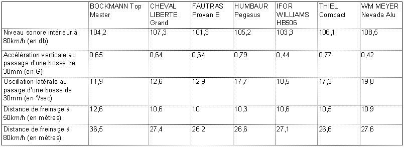 | Freinage : il y a fort peu de différences, tous les résultats sont bons sauf pour le BOCKMANN qui obtient des résultats désastreux. | |
